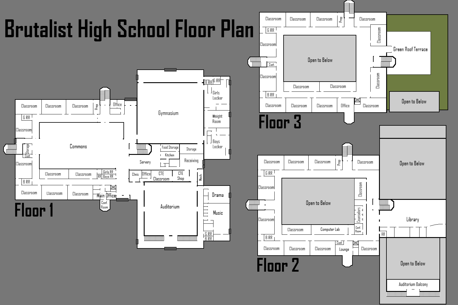 The High School features a green roof terrace designed to provide students with access to outdoor space and fresh air.Working on the Brutalist High School was an enjoyable project. All the high school buildings I've shared on the Steam Workshop are my original creations, each designed to reflect the era I intended. They're also realistically sized, featuring every room a school typically requires. To illustrate my vision for each high school building, I've included a fictional floor plan that outlines what I had in mind during the development process. The Brutalist High School follows this same approach, combining an original design with a custom floor plan.